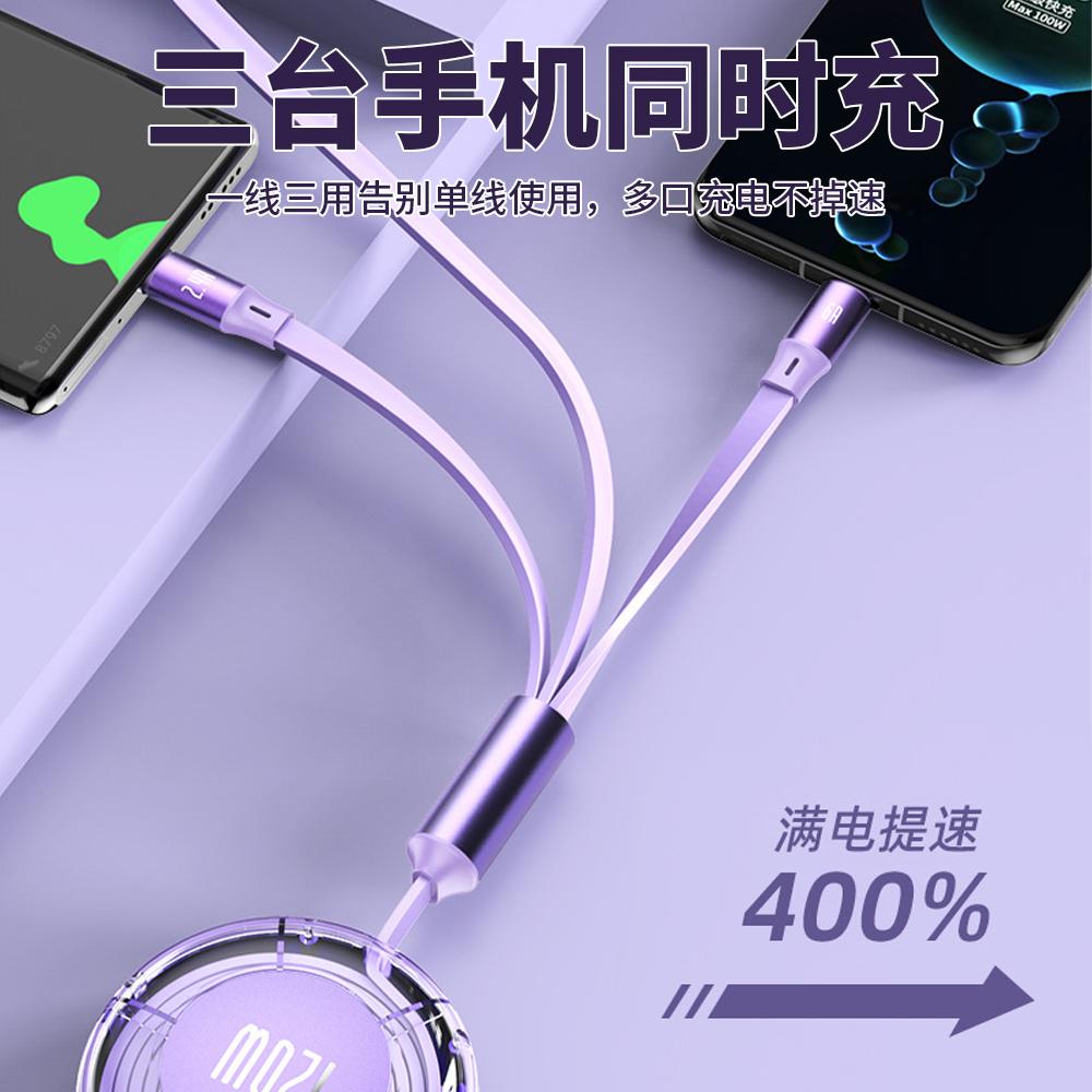 倍思数据线三合一充电线器一拖三快充三头适用多头车载苹果Typec充手机车超级车用汽车USB伸缩多功能多用电器