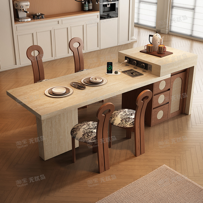 复古风导台岩板岛台餐桌一体可伸缩家用中古风包豪斯高级感倒台桌