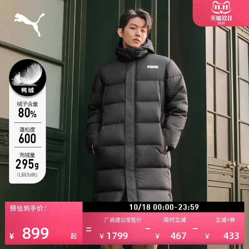 600蓬80绒宽松长款连帽鸭绒外套男子PUMA彪马新款冬季运动羽绒服