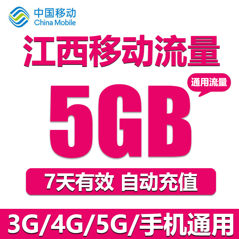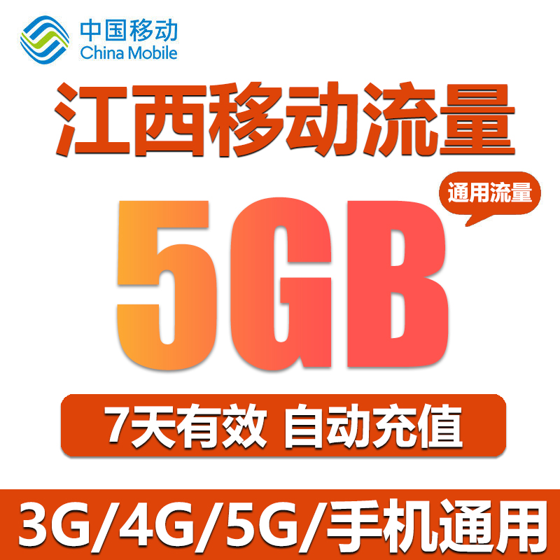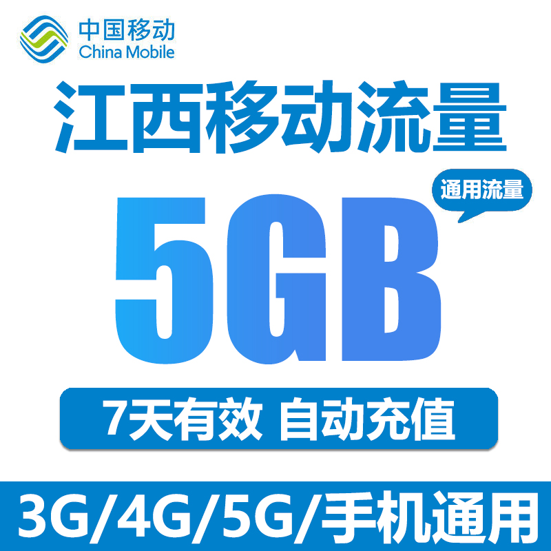 江西移动流量充值 5GB 全国流量2/3/4G通用流量包 7天有效 直充