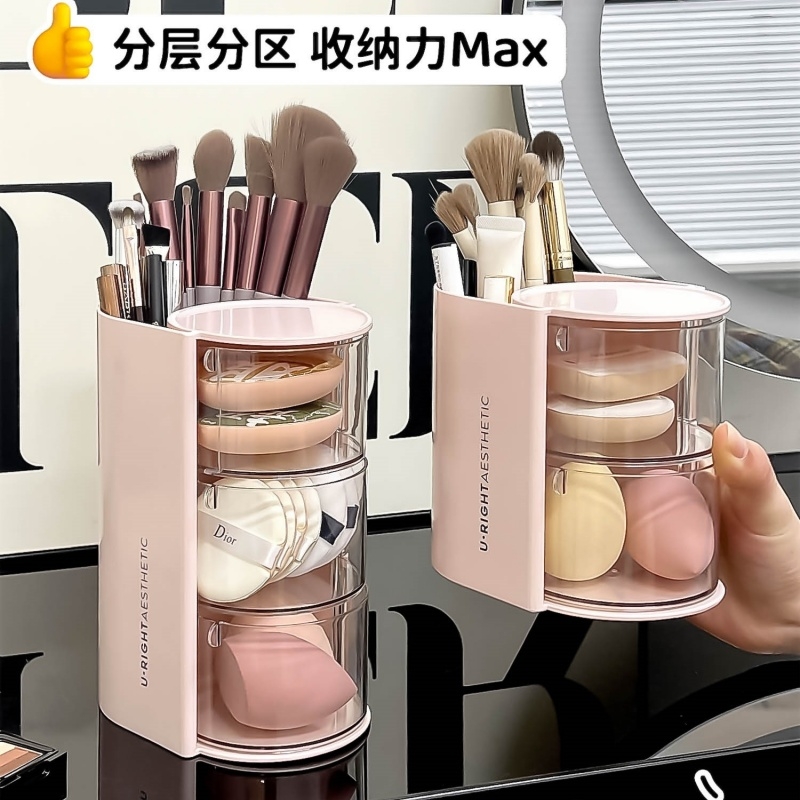 粉扑收纳盒旋转防尘桌面美妆蛋口红化妆刷收纳筒置物架刷子二合一