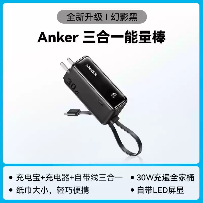 Anker安克三合一充电宝typec带插头移动电源plus能量棒30W充电器充电宝10000毫安自带C线适用苹果16安卓华为