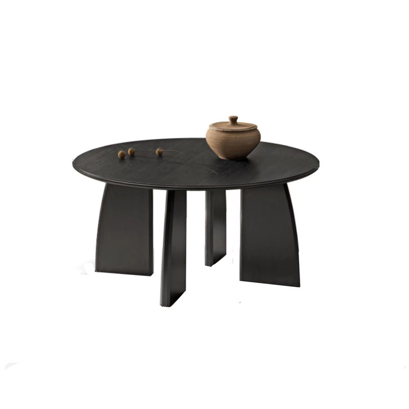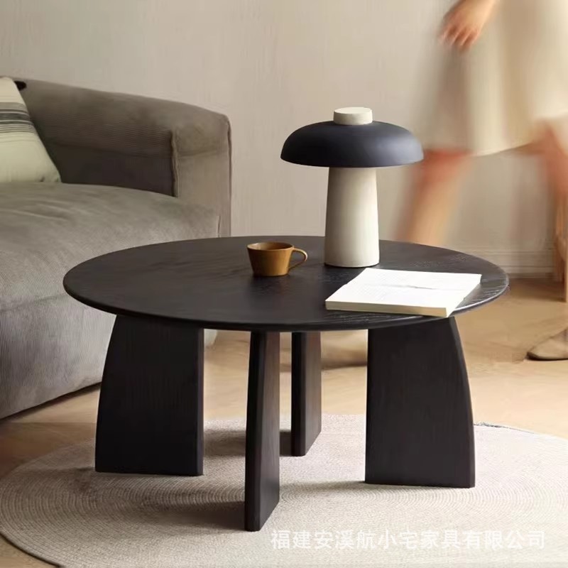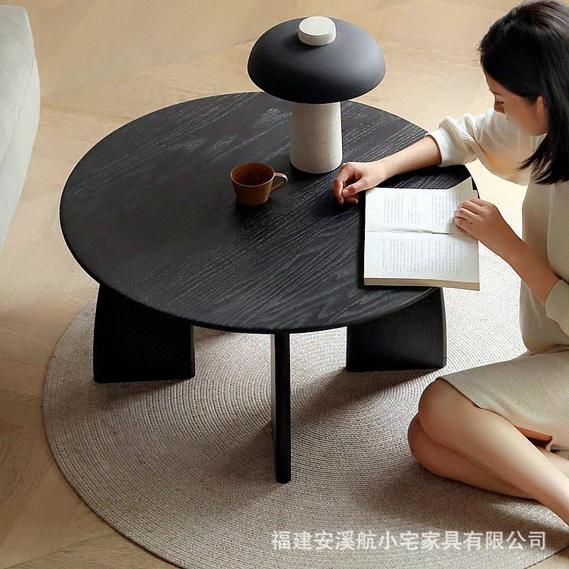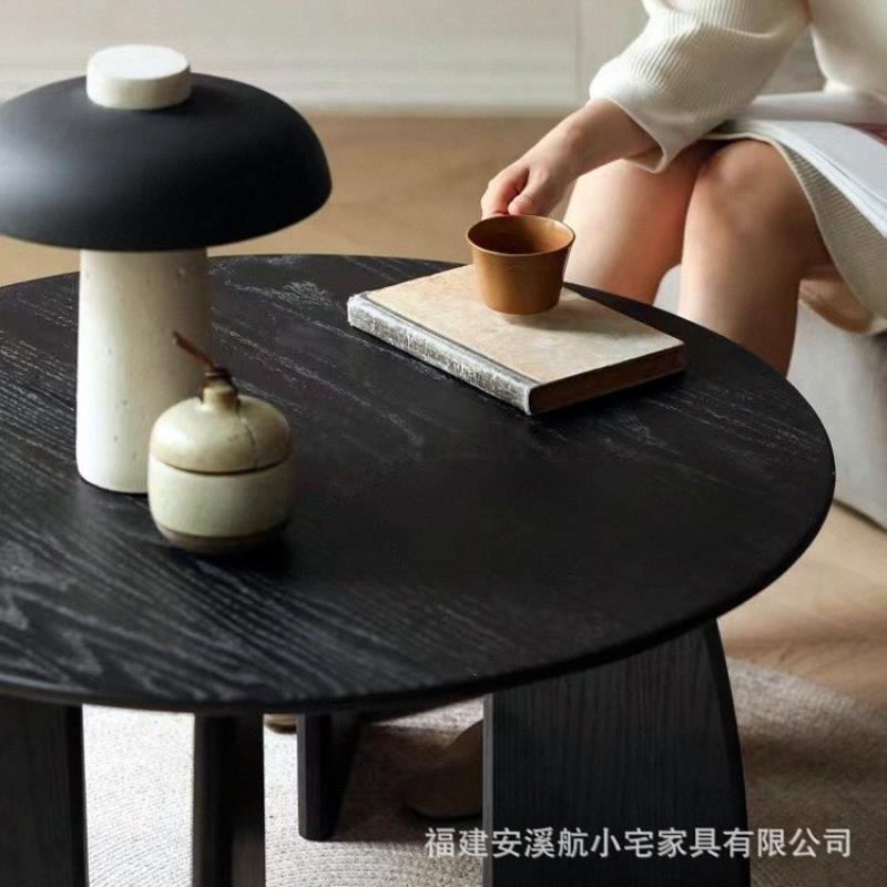 侘寂风实木家用黑色茶桌茶几圆形茶台现代简约茶台矮桌子沙发边几