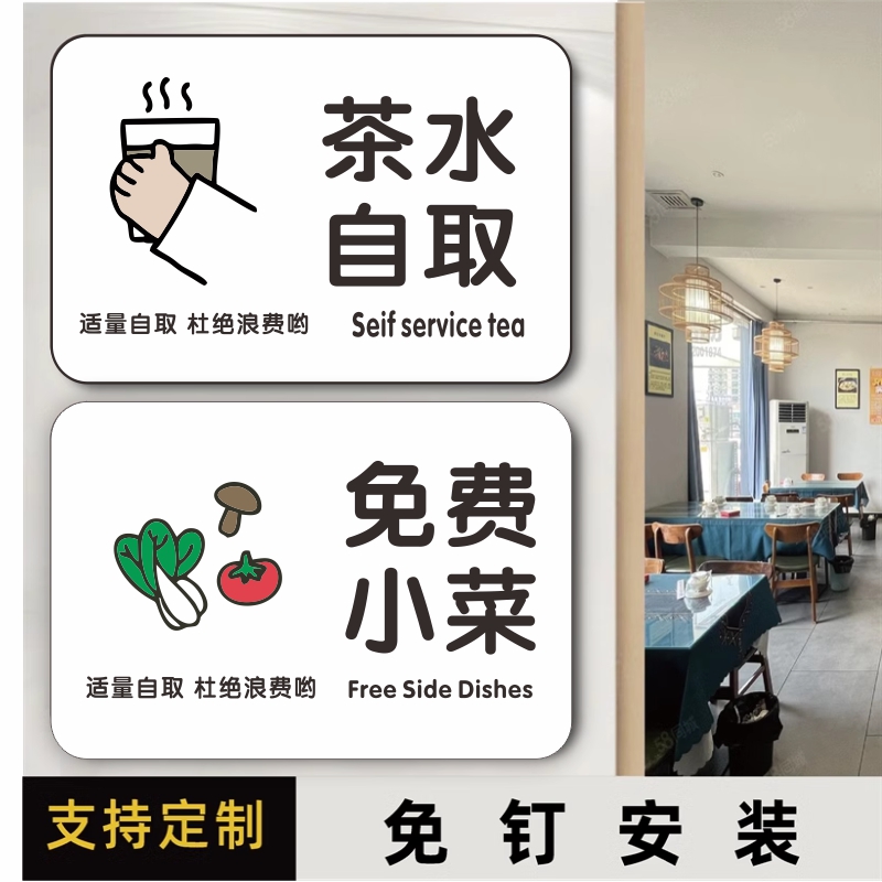 亚克力创意标识牌贴饭店餐厅面馆调料台提示牌免费加米饭牌加面续粉标志牌例汤自助加汤不收费温馨提示牌墙贴