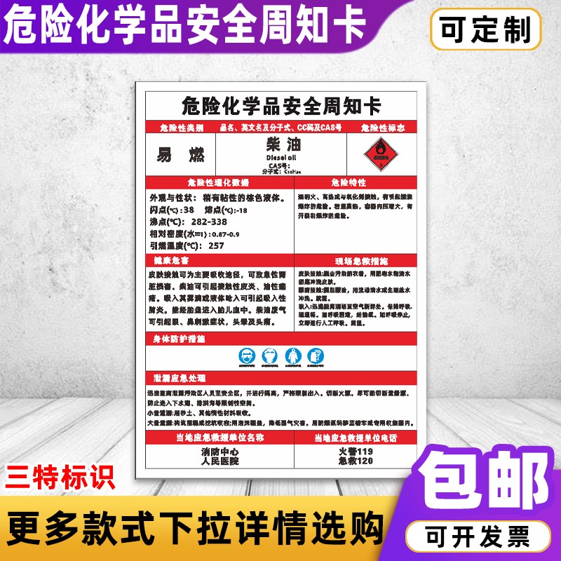 现货速发柴油危险安全周知卡乙炔盐酸硫酸危害告知卡