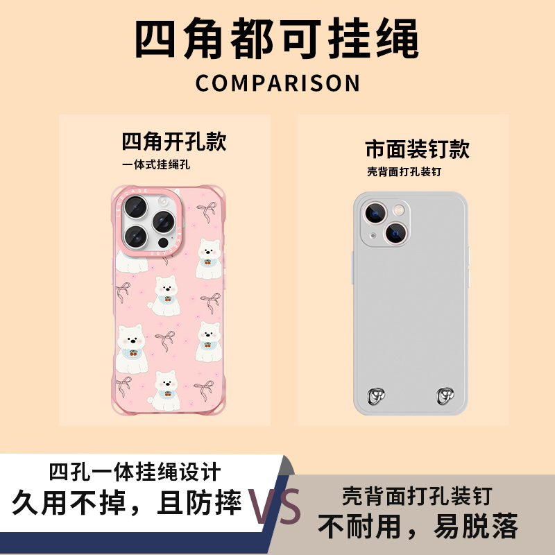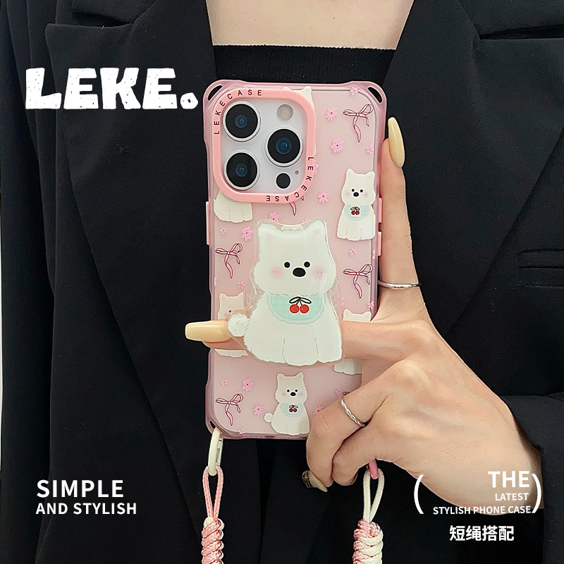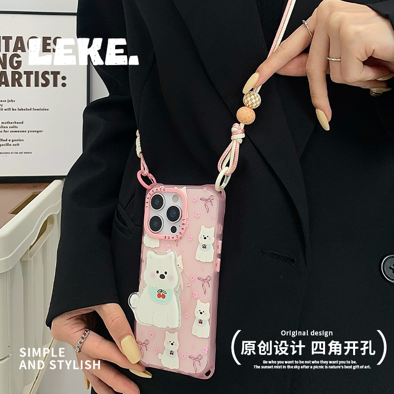 韩系粉色樱桃小狗适用苹果12手机壳挂绳斜挎可背iphone16promax四角开孔15支架17背带斜跨13链条手提14挂链16