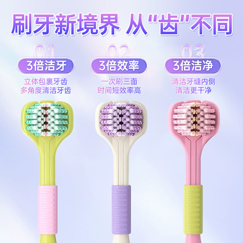 三面牙刷成人软毛男女专用可刮舌苔全面包裹清洁家庭装三色多巴胺