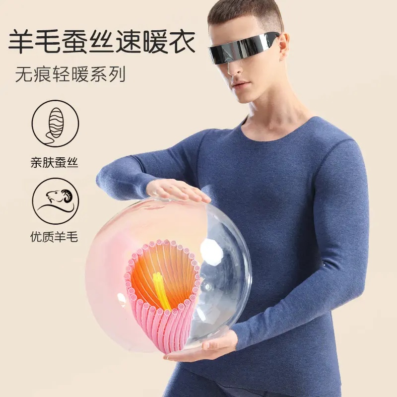 雅鹿秋冬季羊毛蚕丝保暖内衣男士德绒发热无痕秋衣秋裤套装打底衫