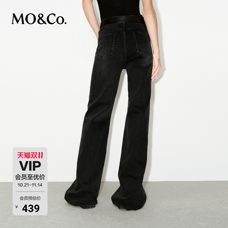 MOCO牛仔裤匠心洗褪磨白棉质微弹中腰及地微喇长裤摩安珂