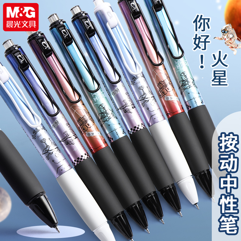 晨光你好火星限定款秒干黑色中性笔大容量按动静音款高颜值大容量三倍书写长度考试专用碳素笔芯特别好写系列