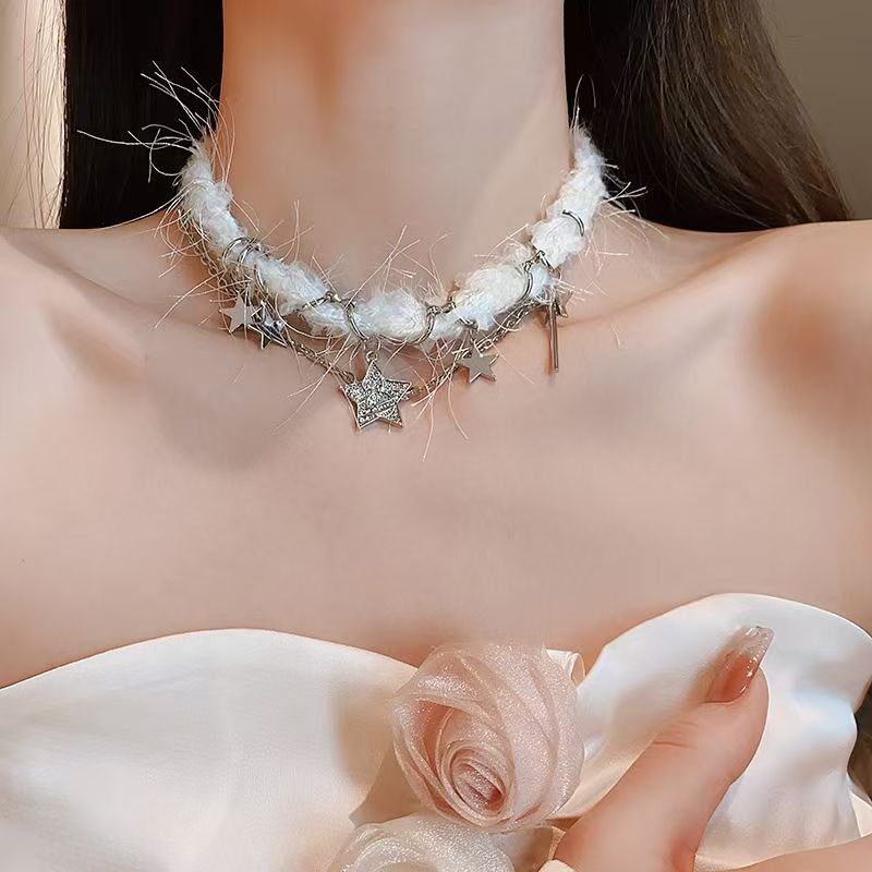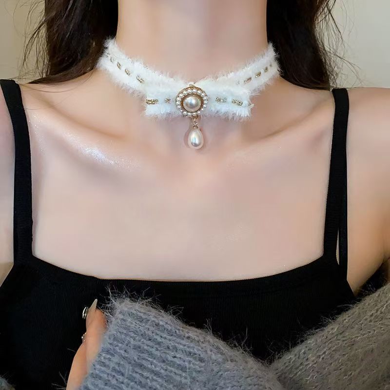 初雪之约~秋冬毛绒蝴蝶结珍珠颈链小众设计锁骨链轻奢高级感项链