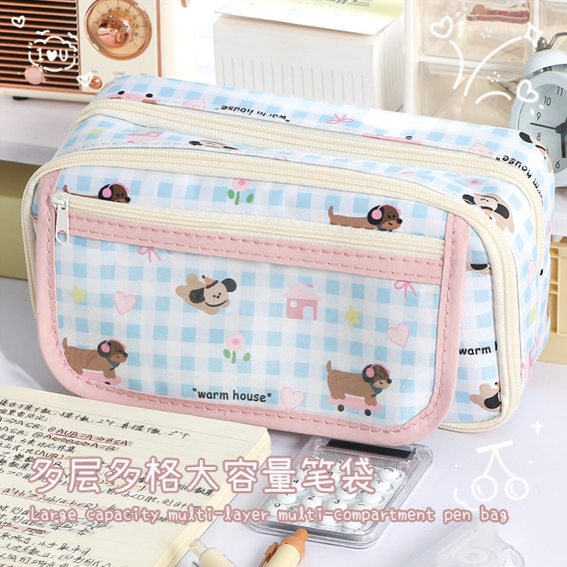 小红书高颜值ins风蓝格子大号卡通可爱格子大容量修狗笔袋多功能小众耐脏中小学生文具袋