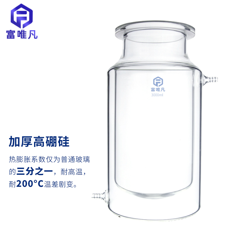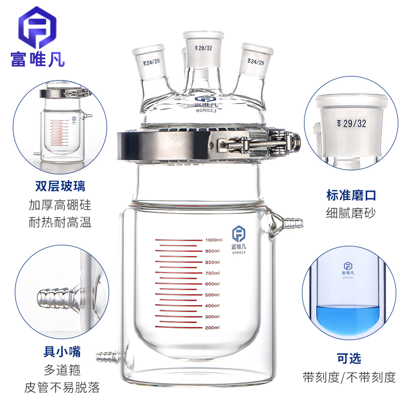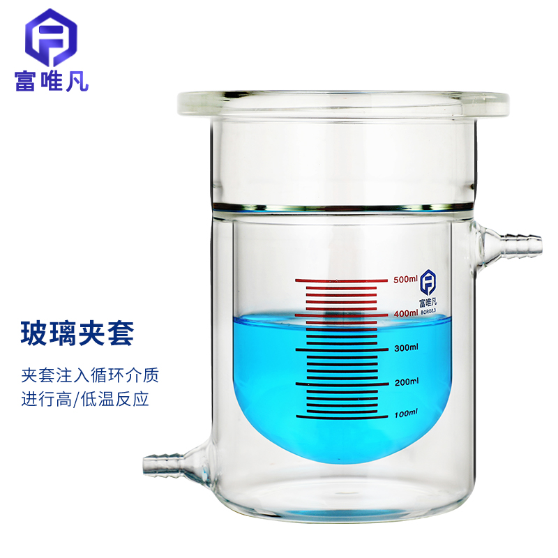 富唯凡 双层夹套开口反应器玻璃反应釜带刻度广口反应瓶三口四口实验室烧杯250/500/1000/2000/3000ml毫升