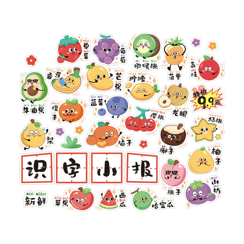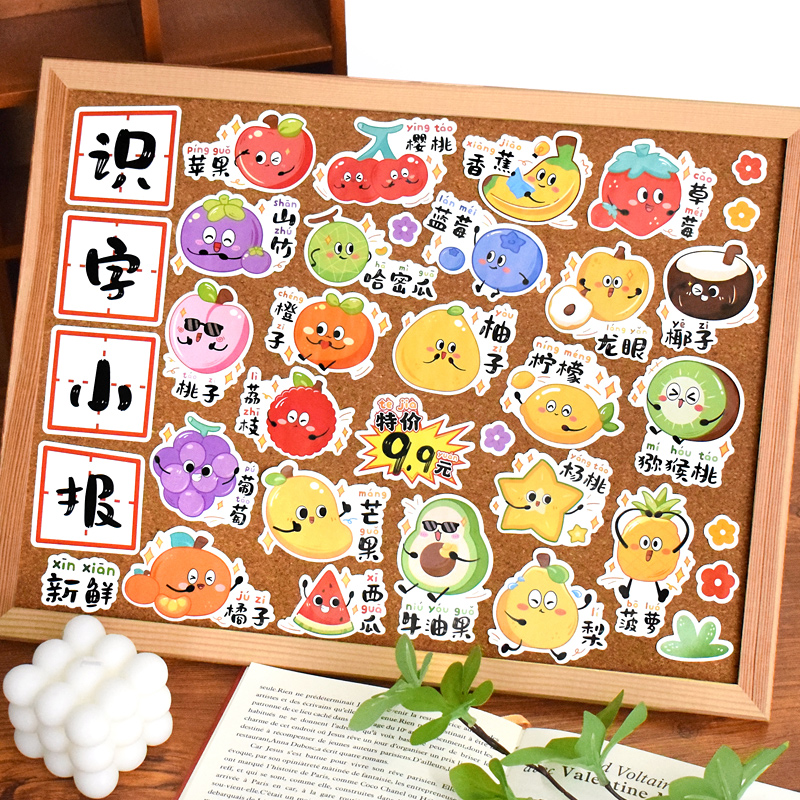 创意水果识字小报装饰贴纸儿童拼音识物趣味不干胶可爱卡通小贴画