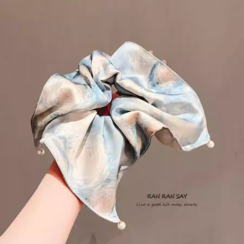 燃彩珍珠超大号晕染缎面高级感方巾大肠发圈女高级感蓝色头绳头饰