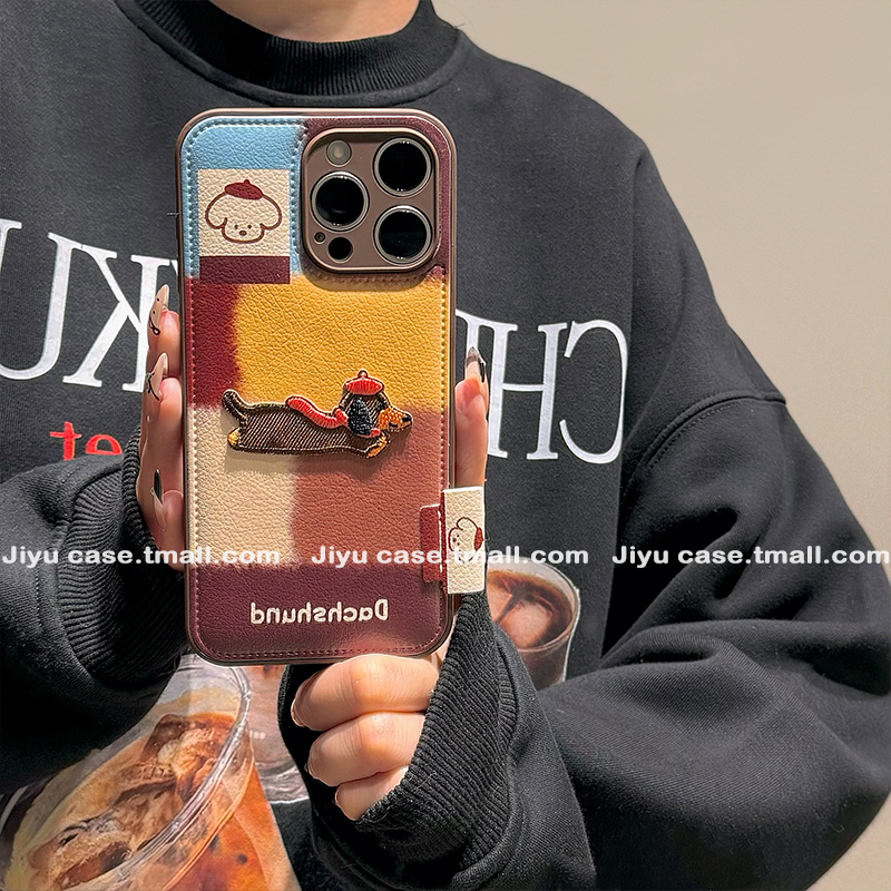 秋冬复古格纹立体刺绣小狗适用苹果16promax手机壳iPhone15蛇年新款13卡通14pm小众16pro皮质15pro女12全包软