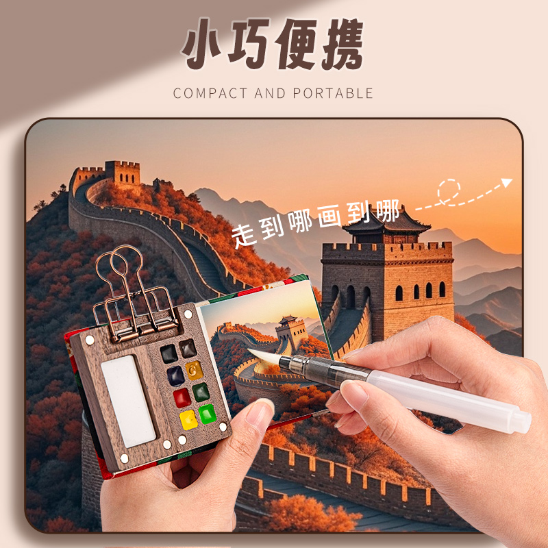 迷你水彩颜料盒和小本子史明克8色木盒国风迷你小画板固体水彩画画本旅行写生便携式调色盘手账本亚克力分装