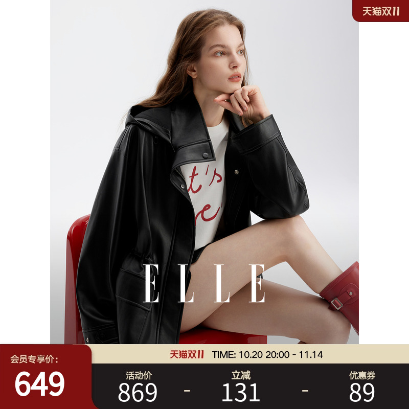 ELLE摩登连帽皮风衣外套女2025秋新款防风廓形高级感宽松通勤上衣