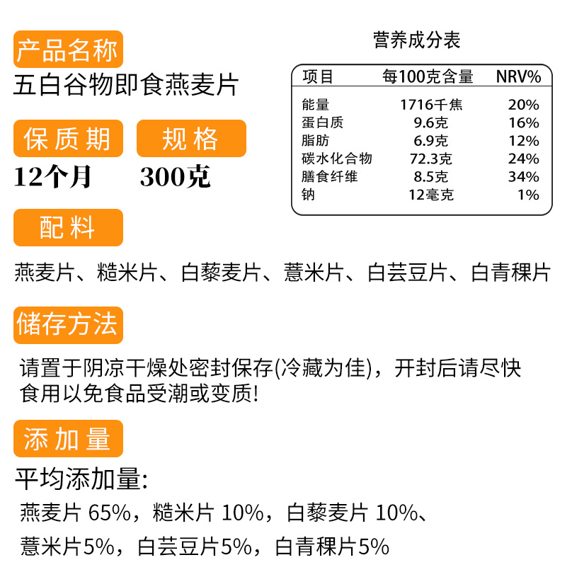 五白谷物即食麦片免煮早餐0添加蔗糖高膳食纤维糙米片燕麦片即食