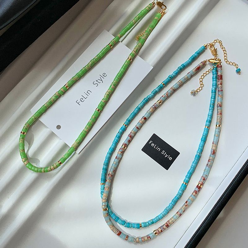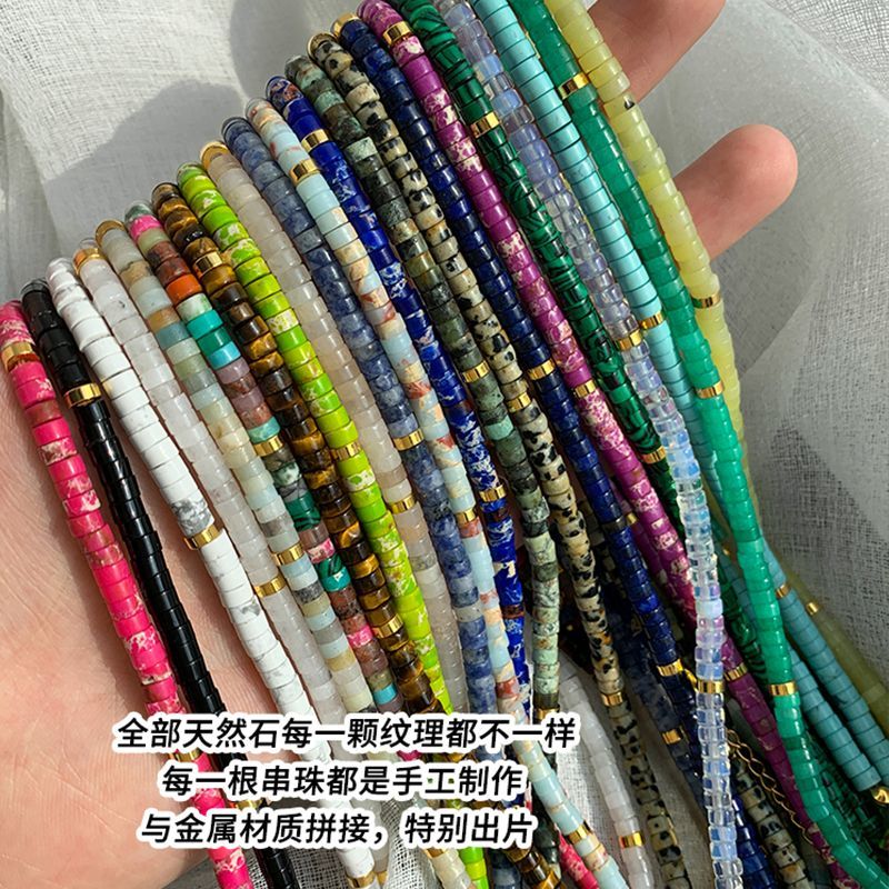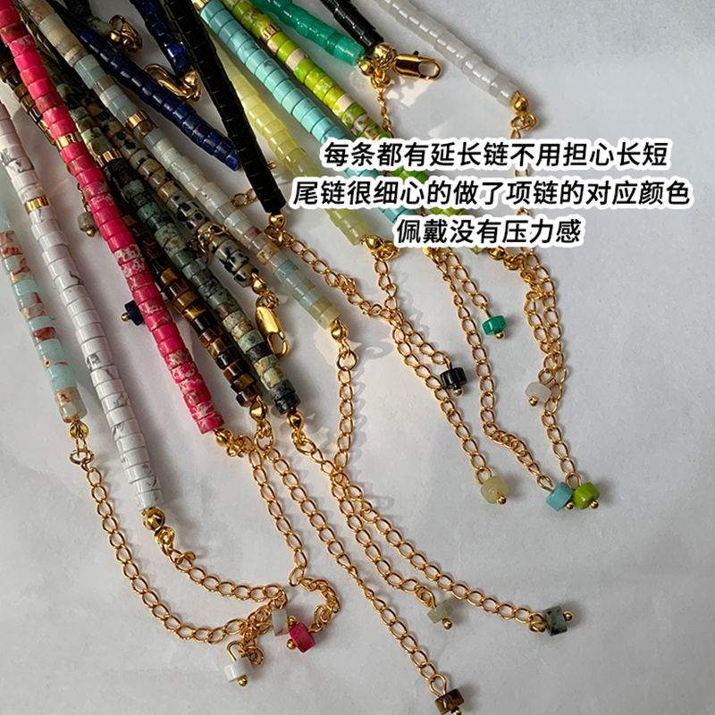 天然绿松石头彩色琉璃串珠项链女叠戴复古锁骨链颈链虎眼石青金石