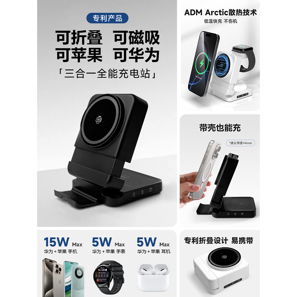 三合一无线充电器磁吸式可折叠通用适用华为Mate70Pura80Pro手机iwatch11手表GT5苹果iPhone17多功能快充支架