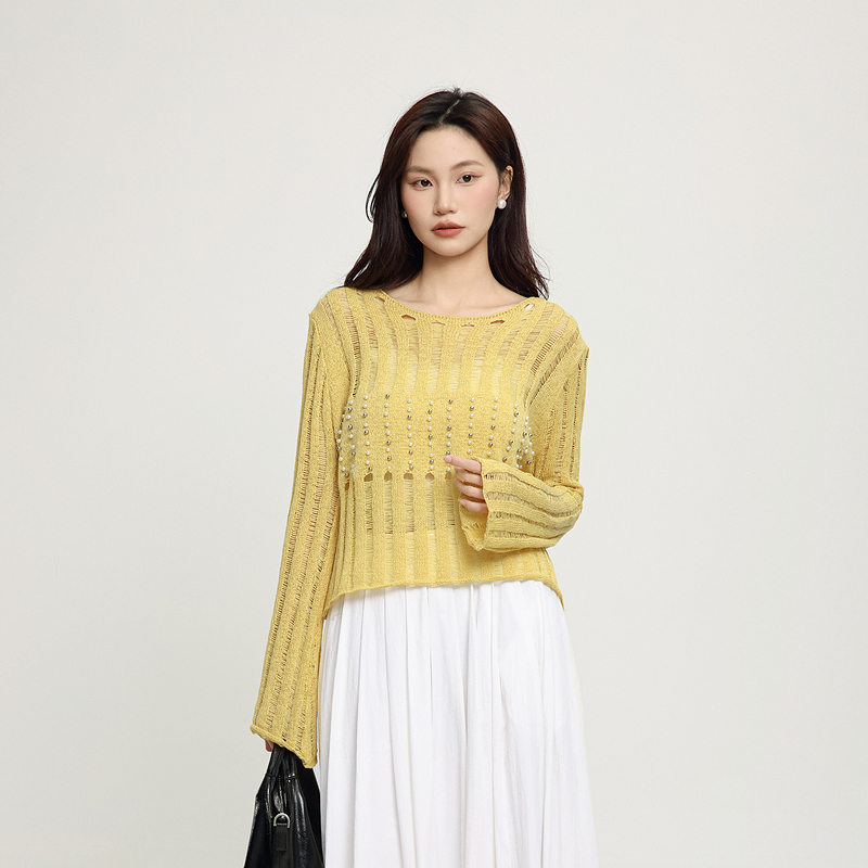 记忆的起点圆领毛衣微透时尚宽松针织衫女2025夏季新款69GX55005