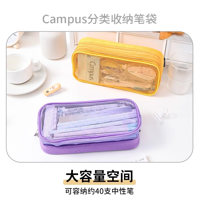 日本KOKUYO国誉笔袋单侧网格笔袋Campus系列学生用大容量双层分类收纳包纯色简约学习文具盒笔袋多功能收纳袋