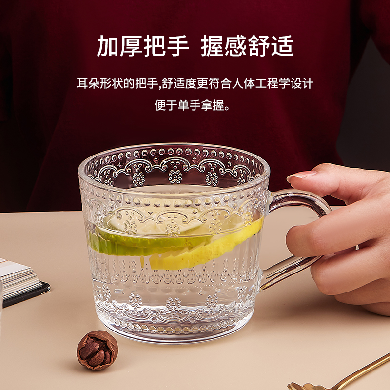 复古浮雕玻璃杯高颜值燕麦碗耐高温可微波加热带盖勺大容量上班族