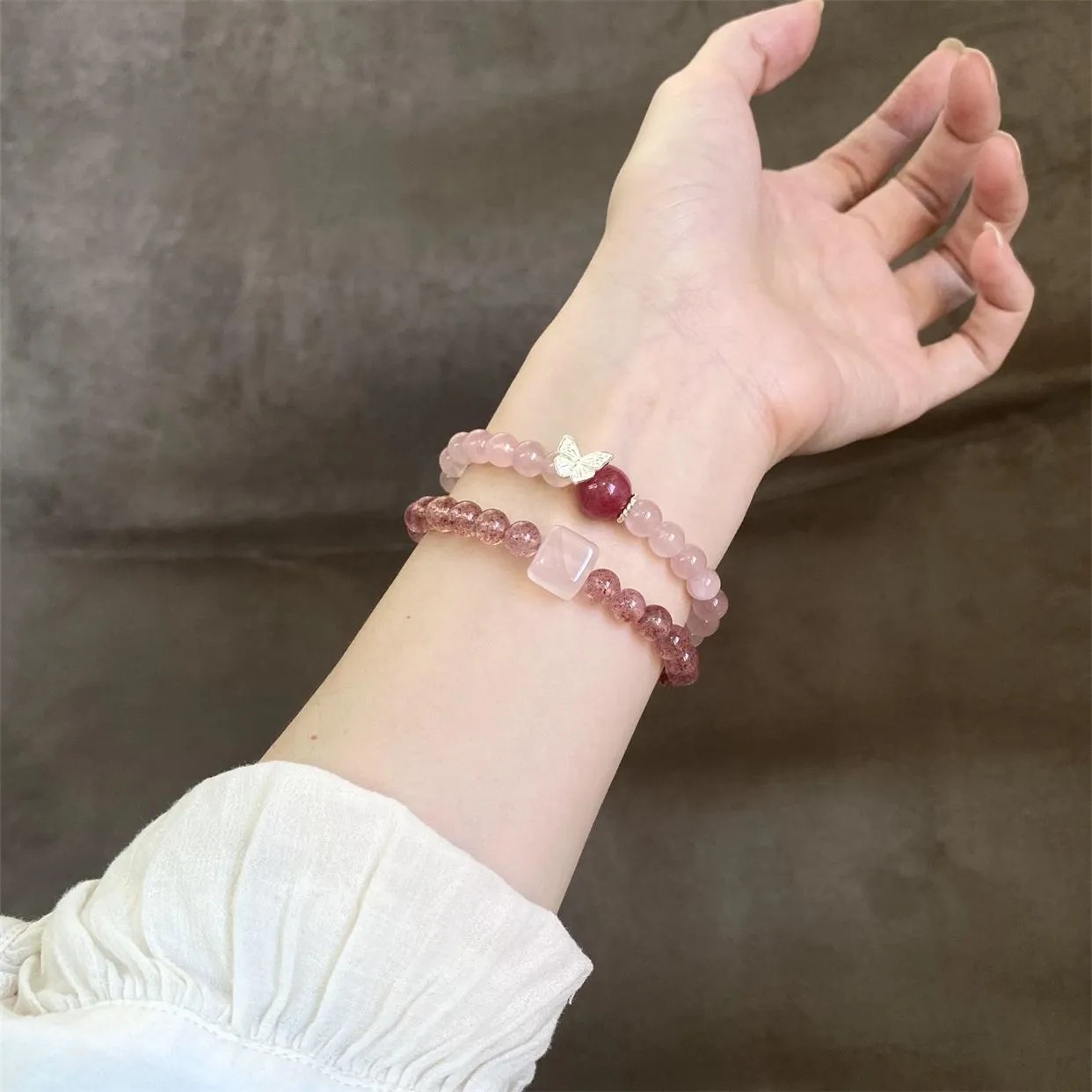【破茧成蝶】招正桃花草莓晶粉晶蝴蝶双圈天然水晶手双圈女款手链
