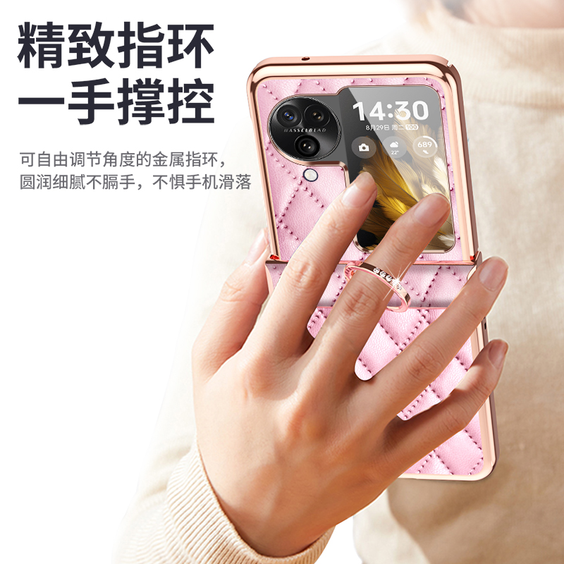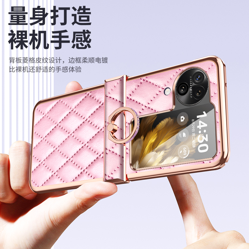 适用于 OPPO Find N3 Flip手机壳棱格皮纹大牌菱形小香风findn3filp侧边铰链指环支架高档皮料小屏钢化玻璃膜