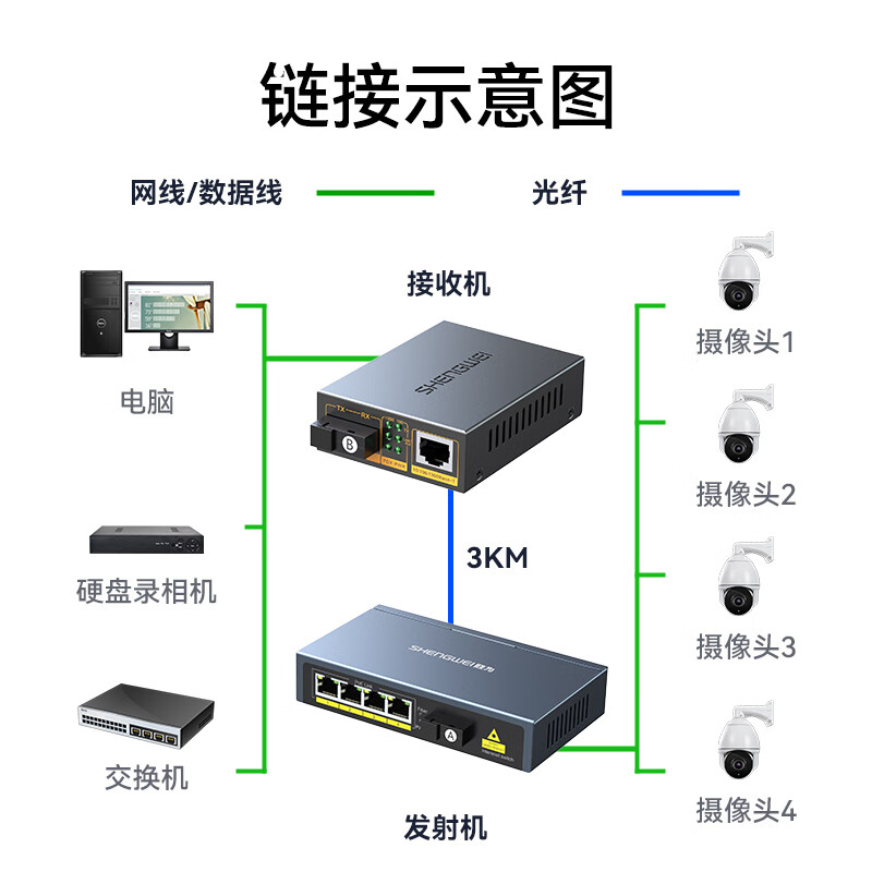 胜为BGH314P2单模单纤POE千兆光纤收发器光电转换器套装光电转换器1光4电+1光1电SC接口千兆3KM公里一对装