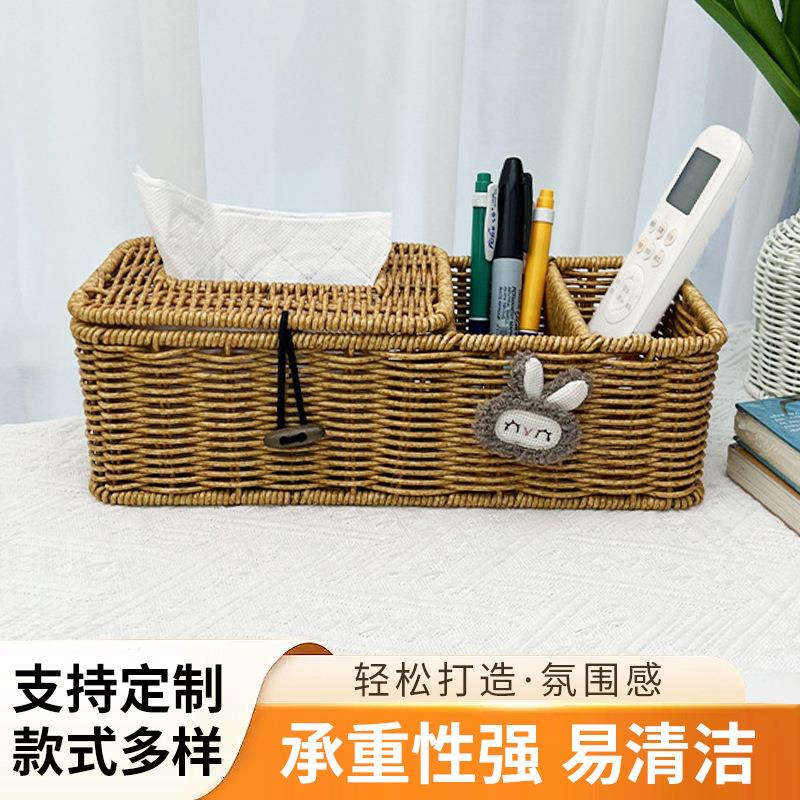 藤编纸巾盒桌面遥控器收纳盒子客厅茶几纸抽盒多功能分格抽纸巾盒