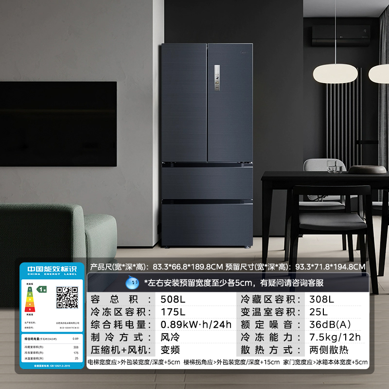 美的508法式双系统多门净味四门双循环无霜一级大容量家用冰箱