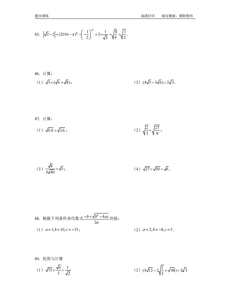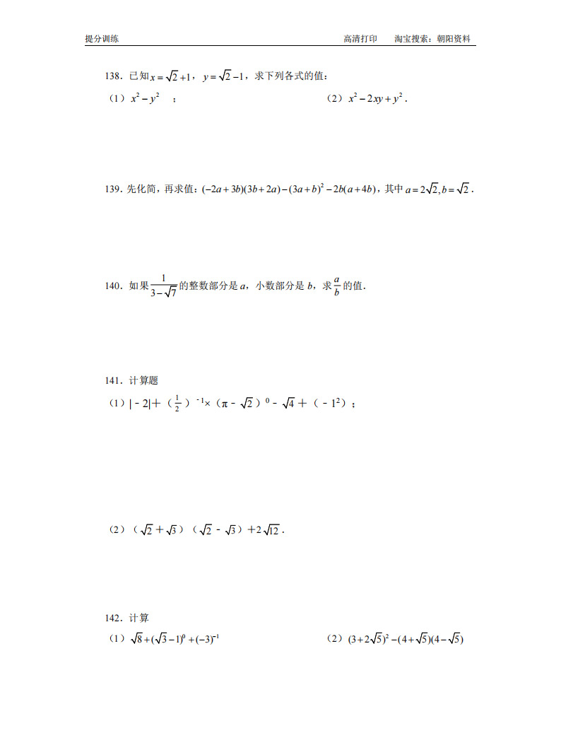 初中数学二次根式计算题专练习加减乘除混合运算化简求值八九年级