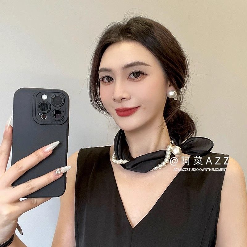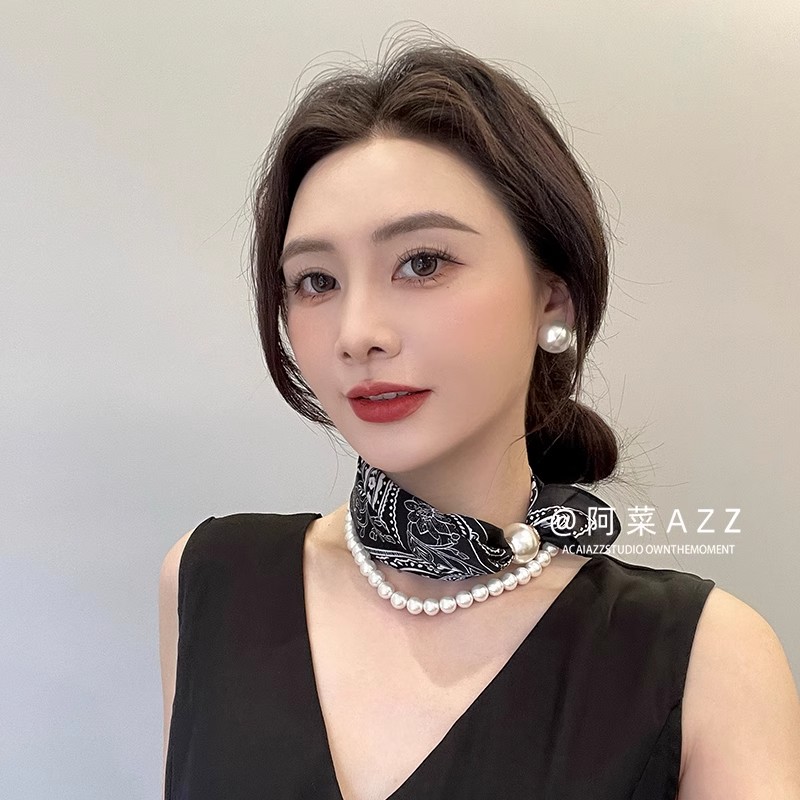 脖子磁吸扣丝巾2025时尚百搭系新款装饰领巾高级感珍珠项链蓝色