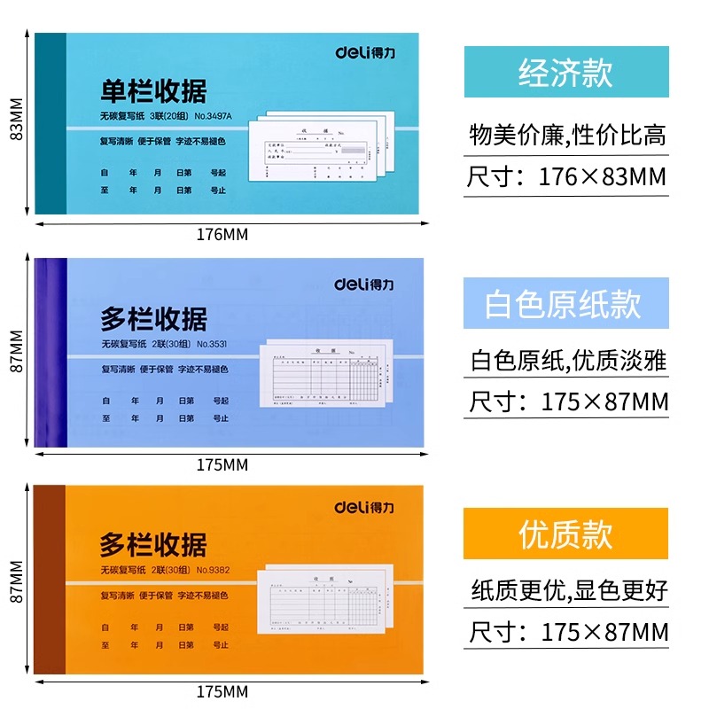 得力收款收据单栏多栏二联三联送货单收料领料单出库入库单销货清单无碳复写收据本财务会计单据手写票据
