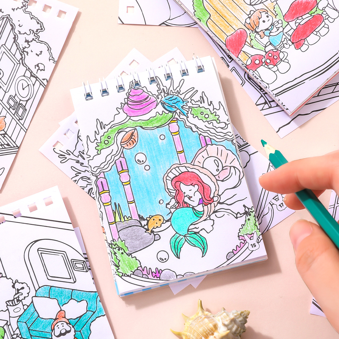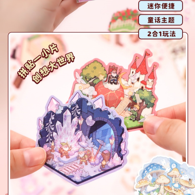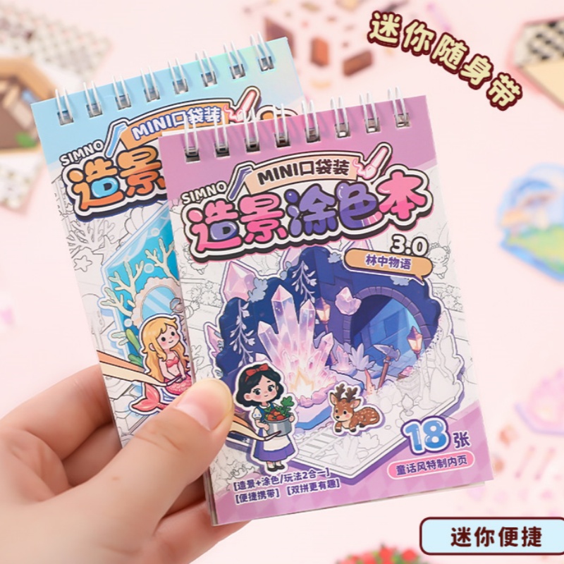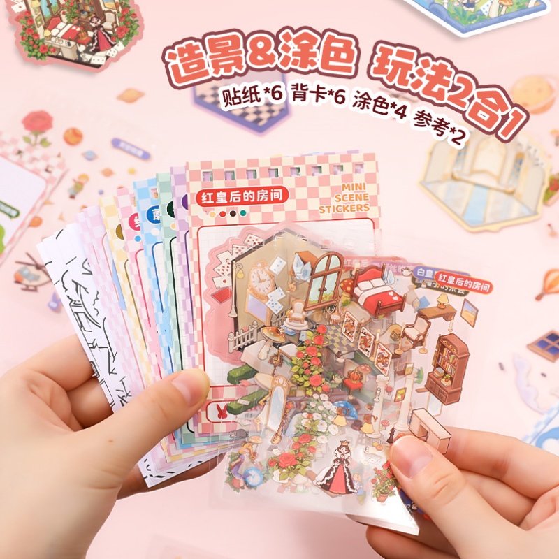 2合1可涂色的造景贴纸迷你尺寸口袋本免剪裁送镊子芯陌3D立体叠堆合集本解压微缩场景DIY大小学生打发时间