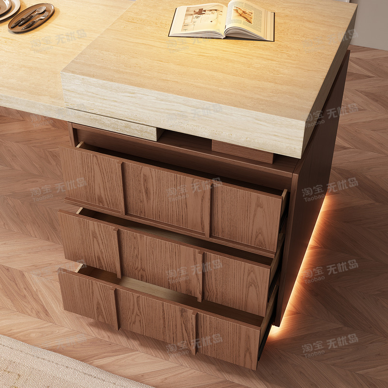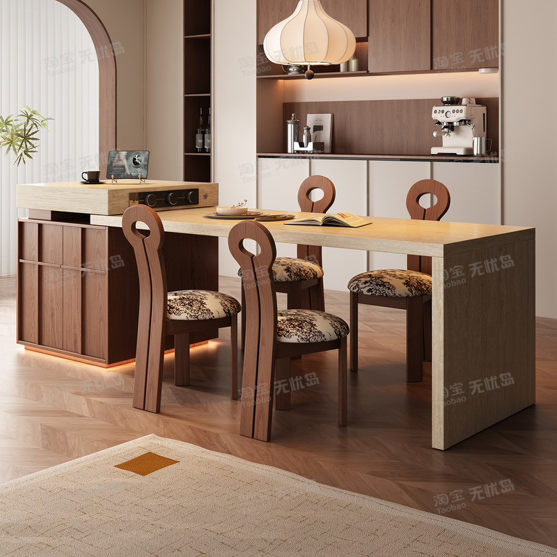 中古风岩板岛台餐桌一体家用可伸缩全岩厨房餐厅法式洞石定制导台