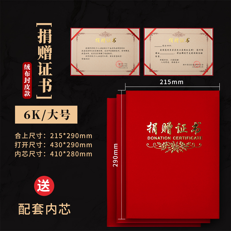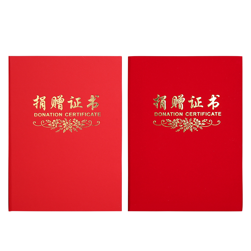 大红绒面捐赠证书慈善爱心捐赠证明证书封面烫金外壳支持企业定制LOGO订做制作捐款证书可提供打印内芯内页