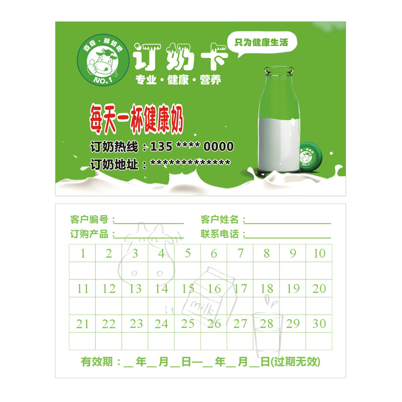 新鲜牛奶羊奶集章名片制作设计高档纸赠送K印刷订奶卡次月卡积分