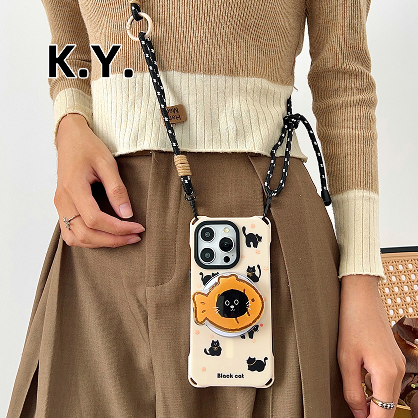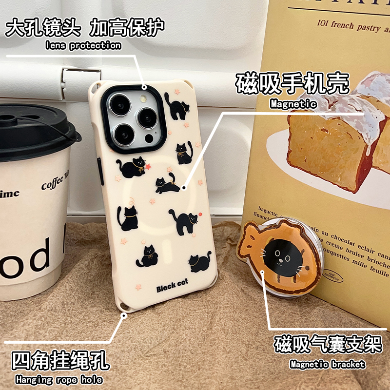 卡通黑猫磁吸支架手机壳带挂绳适用苹果16/15PRO华为mate70小米14/15ultra四角开孔14PM斜挎背带磁吸款保护套
