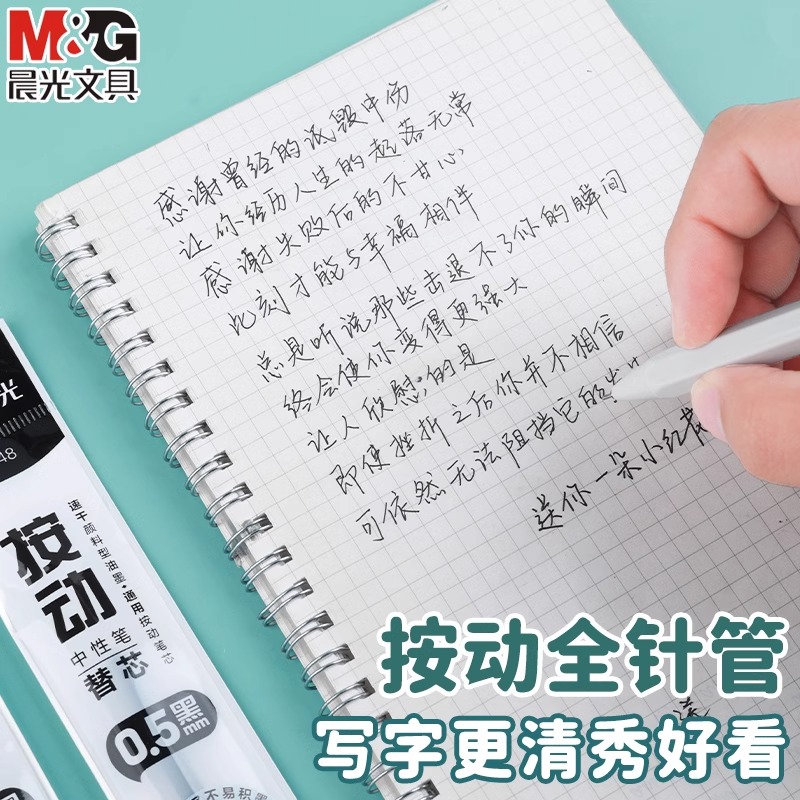 晨光st头笔芯按动笔芯0.5mm黑色中性笔笔芯速干顺滑刷题笔芯替换芯大容量子弹头全针管头双珠头学生考试专用