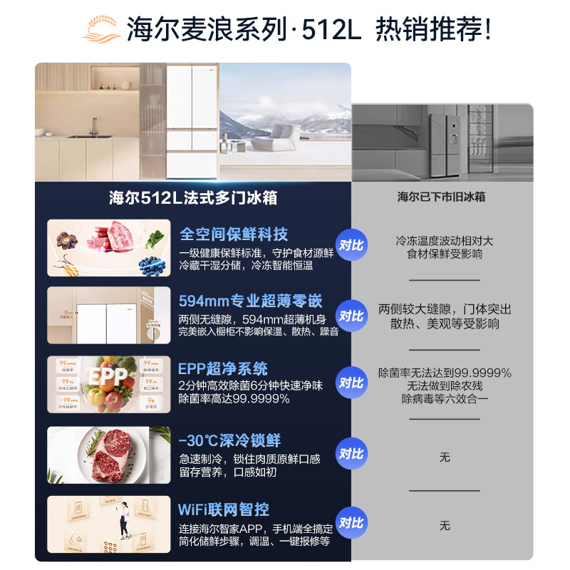 以旧换新补贴海尔麦浪512L法式双开超薄嵌入式冰箱家用无霜一级