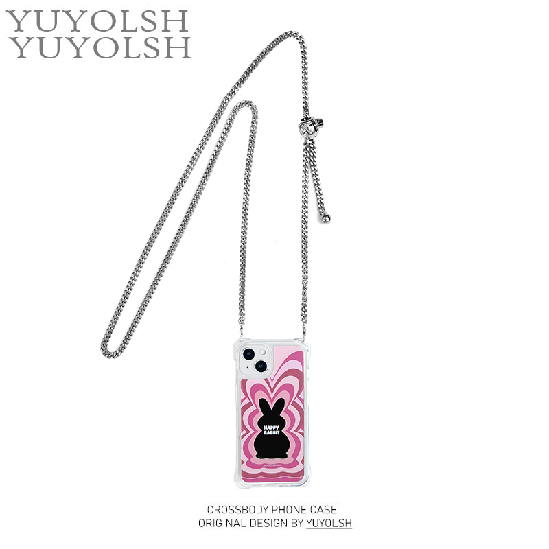 ins风粉色影子兔子镜面补妆金属可调节链条斜挎四角开孔14ProMax手机壳防摔保护套