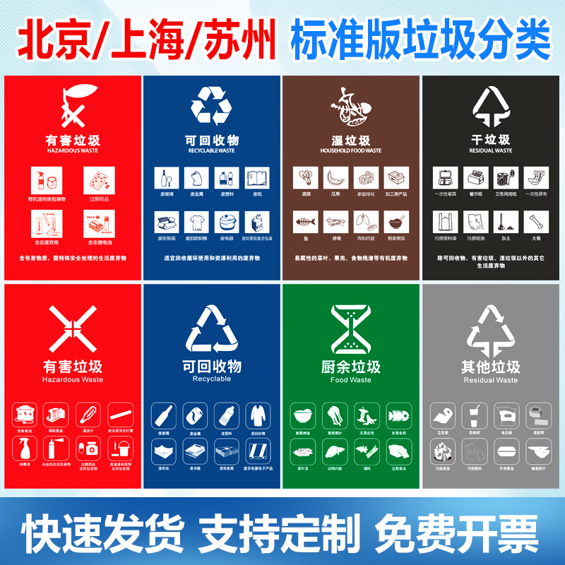国标垃圾桶分类标识贴纸宣传海报墙贴干湿垃圾可回收厨余有害易腐垃圾标识贴北京上海杭州深圳垃圾分类提示贴