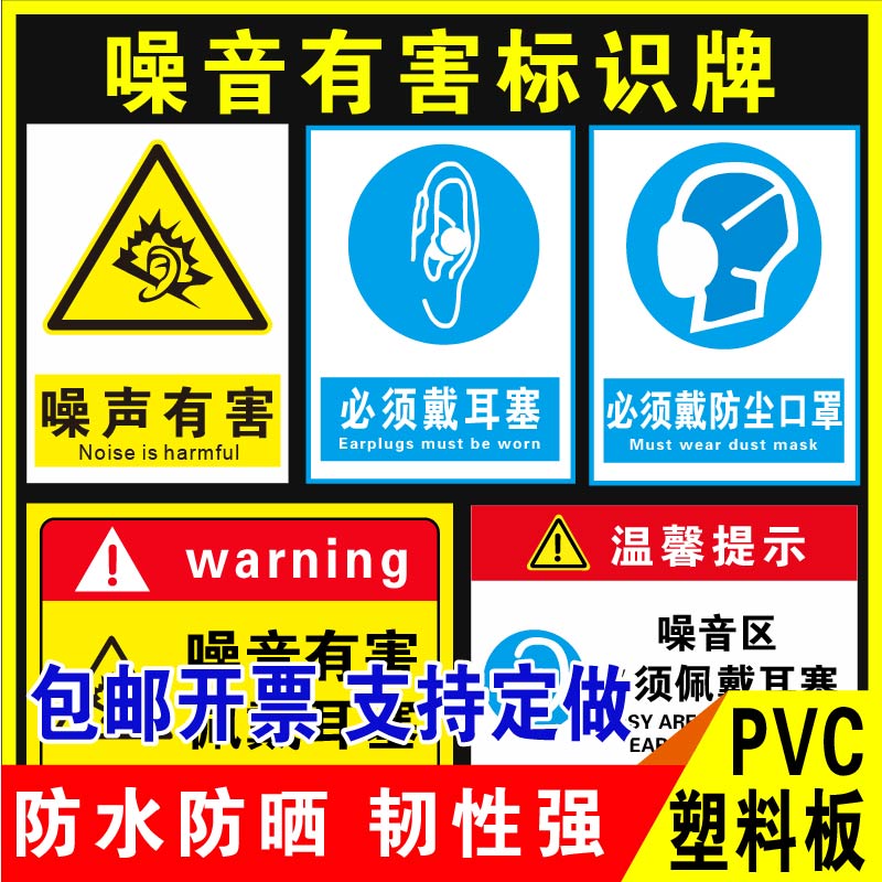 噪音有害标识牌当心噪音警示牌安全标识牌必须戴耳塞护耳器标志贴提示牌警告贴纸PVC板定做定制定做