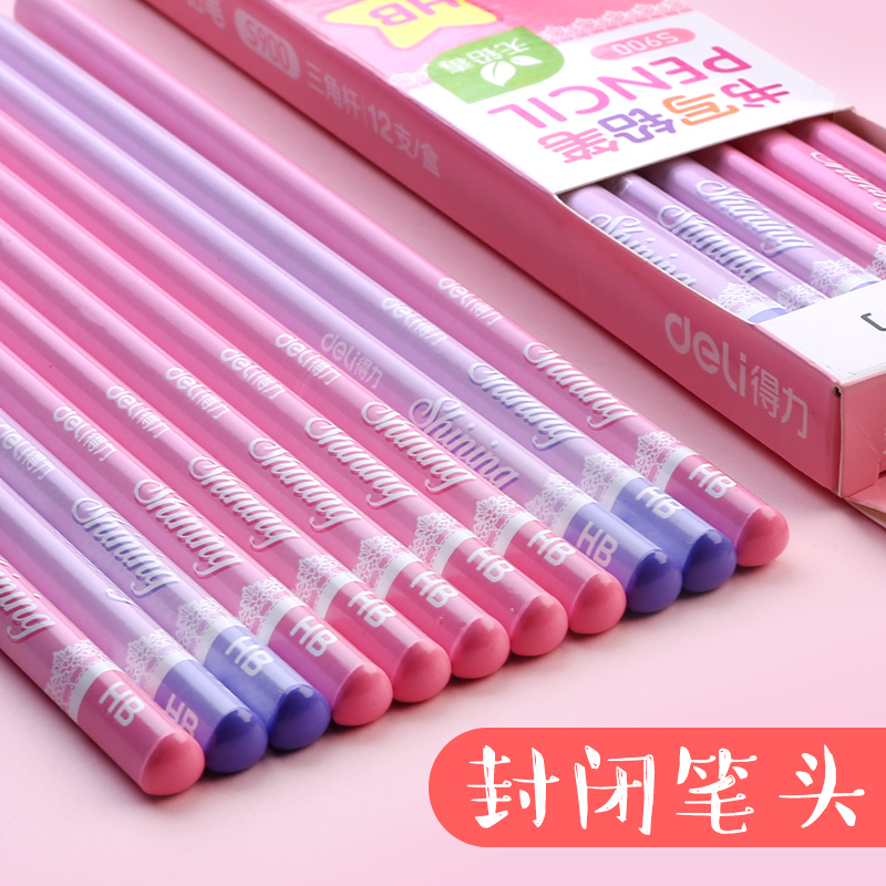 得力三角杆铅笔儿童矫正握姿小学生用HB三角形型无铅幼儿园三棱笔初学者女孩可爱橡皮套装1-3年级一年级