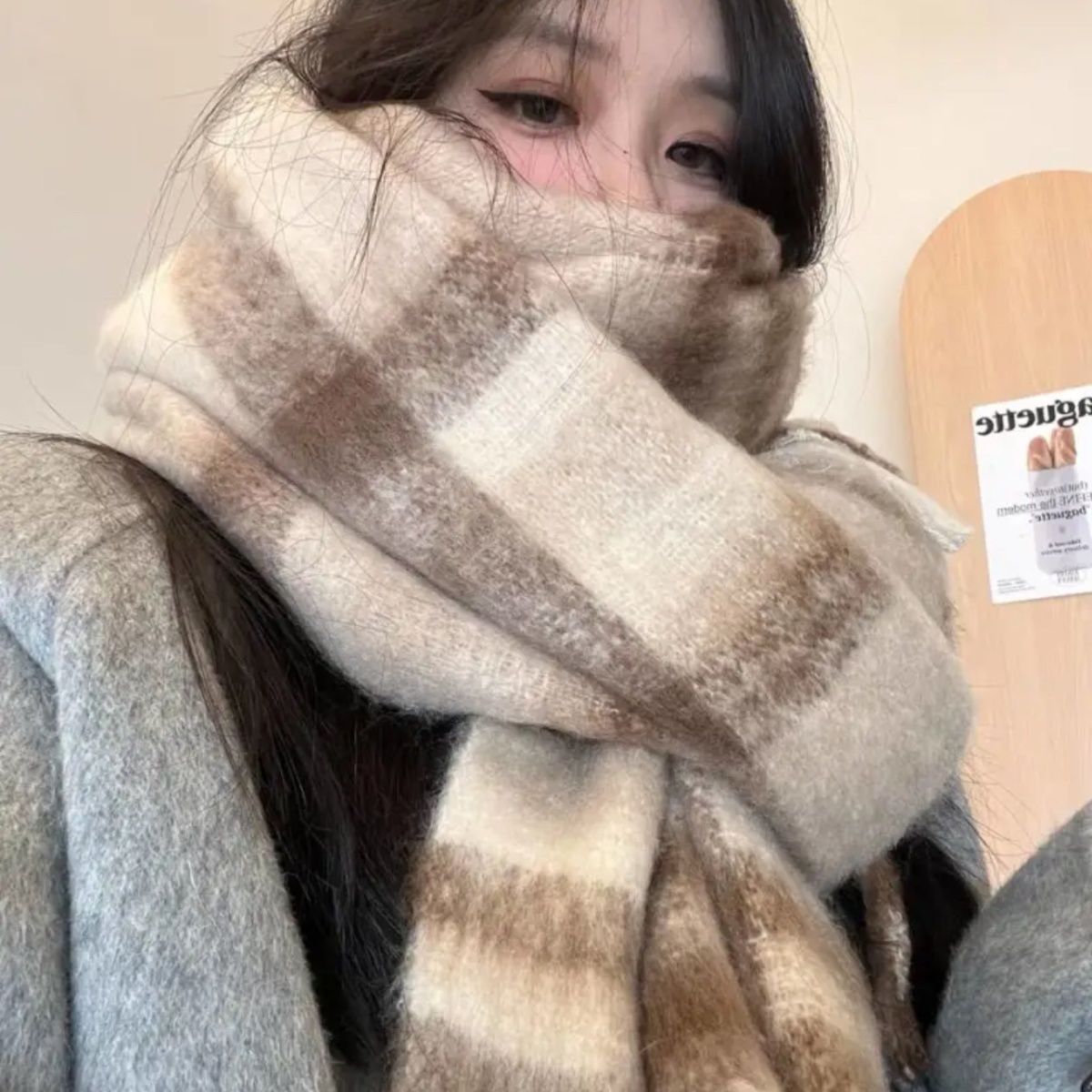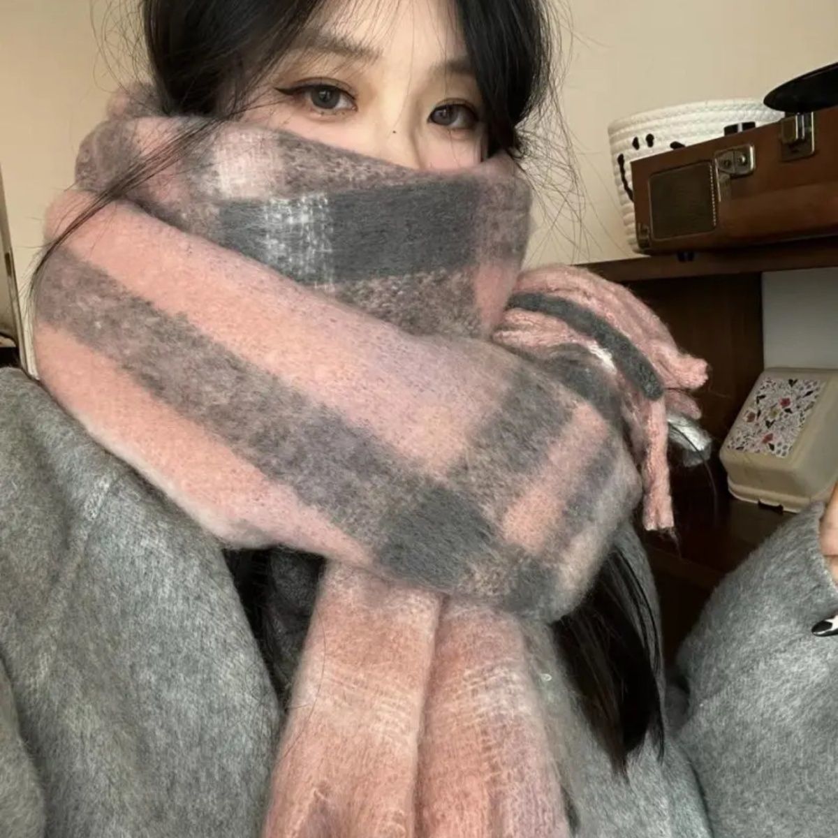 美拉德2025春新款粉色格纹围巾女保暖氛围感韩版时尚文艺防寒围脖