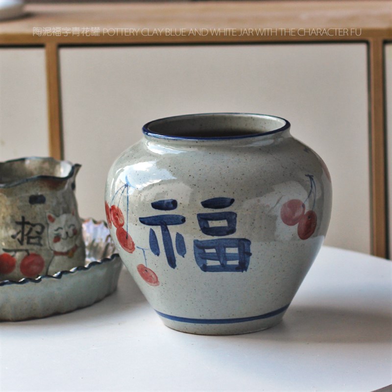 手绘青花瓷花瓶陶瓷复古瓷罐新中式花瓶摆件客厅插花小号喜福字