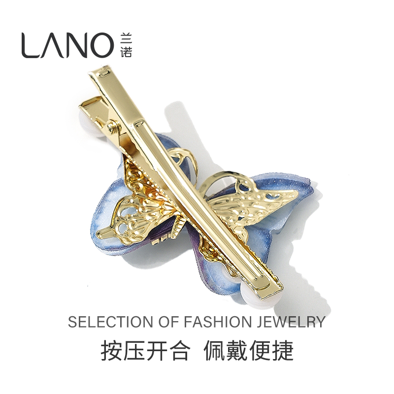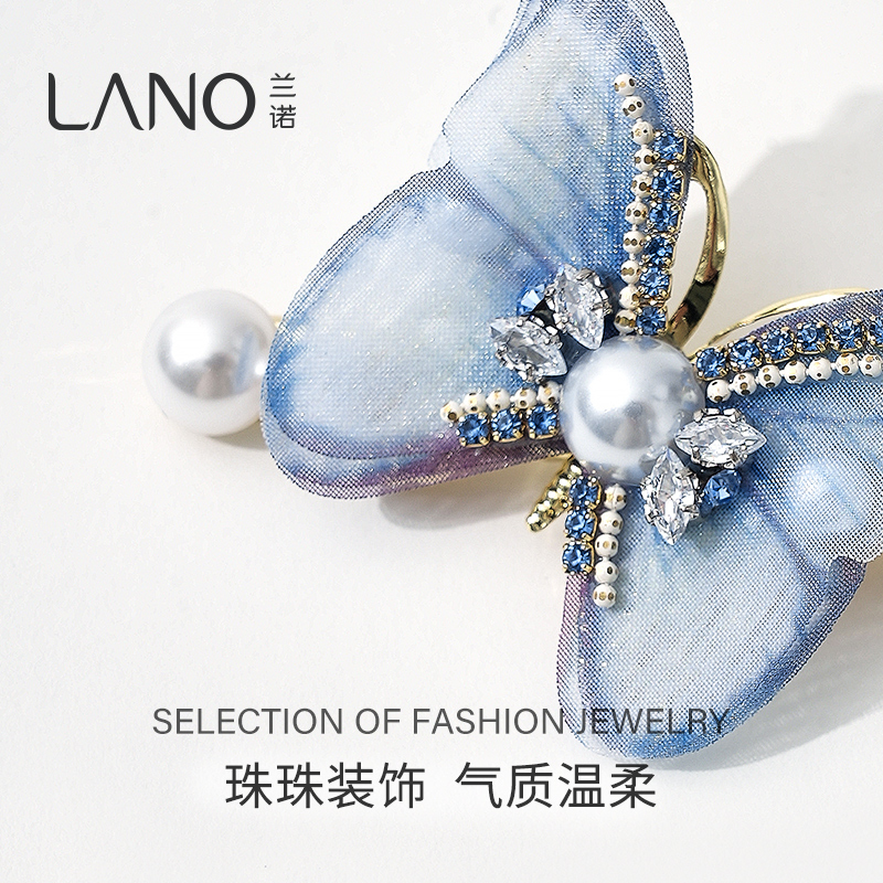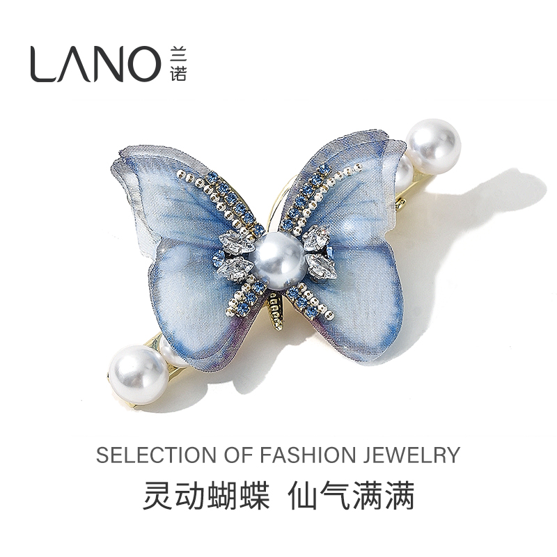 兰诺侧边蝴蝶珍珠发夹女2025年新款高端边夹蓝色夹子刘海前额发饰